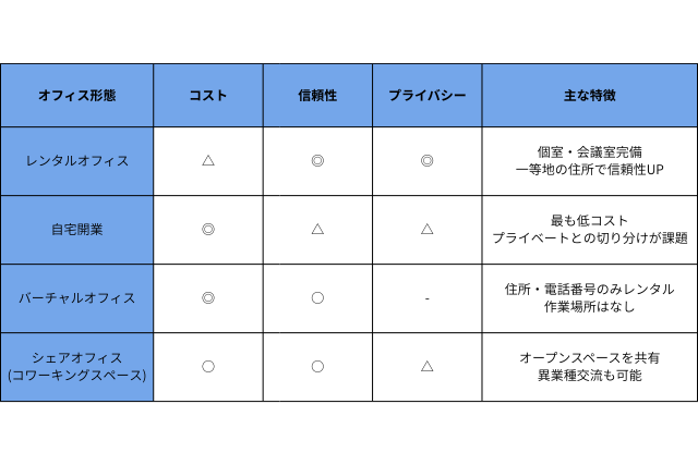 それぞれのメリット・デメリットから、バーチャルオフィスやシェアオフィスとの違い、