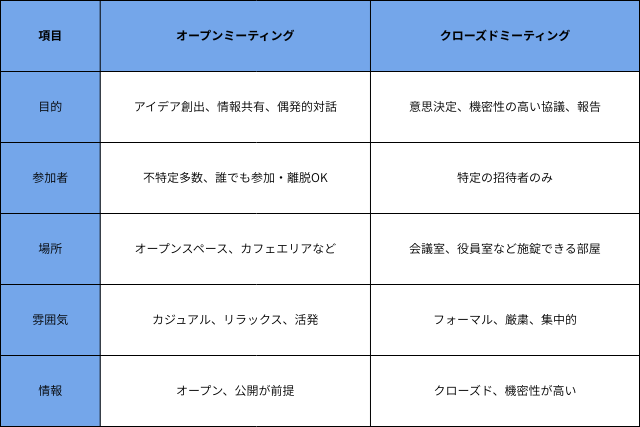 オープンミーティングをより深く理解するために、従来の会議室で行われる「クローズドミーティング」との違いを比較してみましょう。